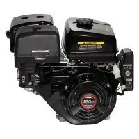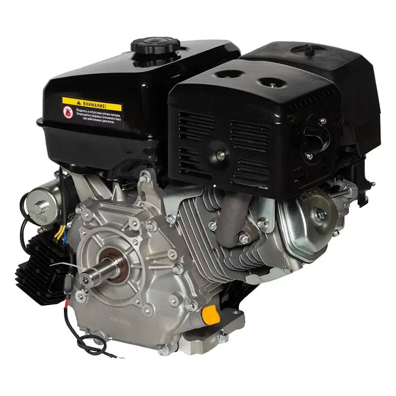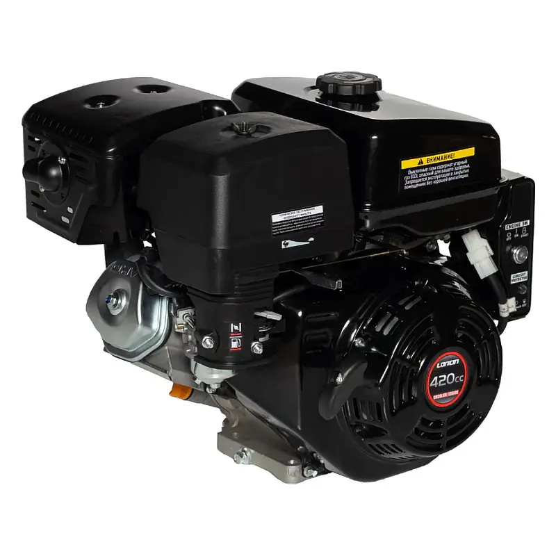 Одноцилиндровый двигатель, объем 420 куб.см, 15 л.с, горизонтальный вал 25 мм, ручной и электрический запуск, катушка освещения 18А.