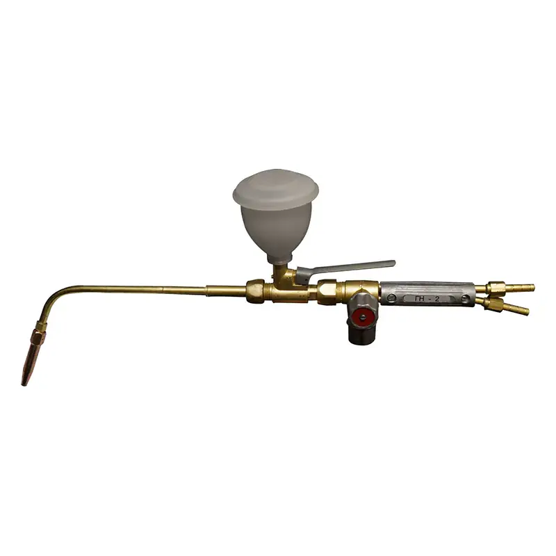 Горелка наплавочная ГН-2 предназначена для газопорошковой наплавки изношенных поверхностей деталей машин и механизмов, рельсов, направляющих и пр., выполненных из стали и чугуна. Материалами, наносимыми на изношенную поверхность, являются гранулированные самофлюсующиеся материалы на основе сплавов систем Ni(Cu)-B-Si, Ni(Co,Fe)-Cr-B-Si и их композиции с карбидом вольфрама. В качестве рабочих газов в горелке используется смесь кислорода и ацетилена.
