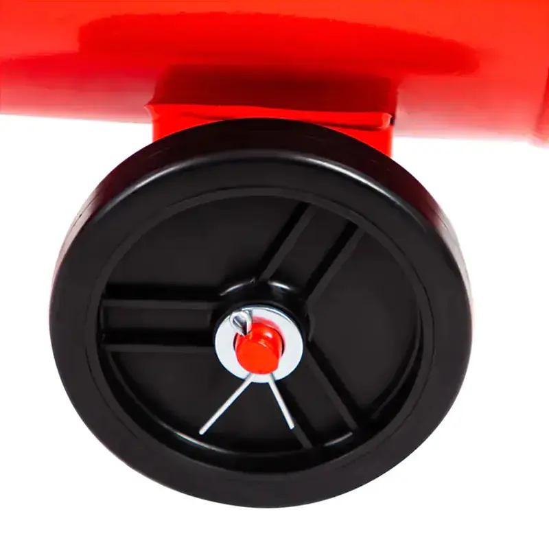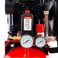Для подключения двух пневмоинструментов есть два выхода («рапид» и «елочка»), которые поддерживают одновременную работу. Модель оснащена защитной системой от перегрева, а контроль давления осуществляется с помощью встроенных в корпус манометров. Для транспортировки инструмента используются четыре колеса. Вес компрессора — 72 кг.
