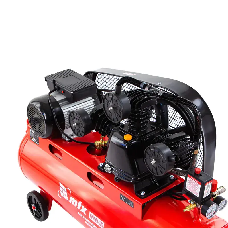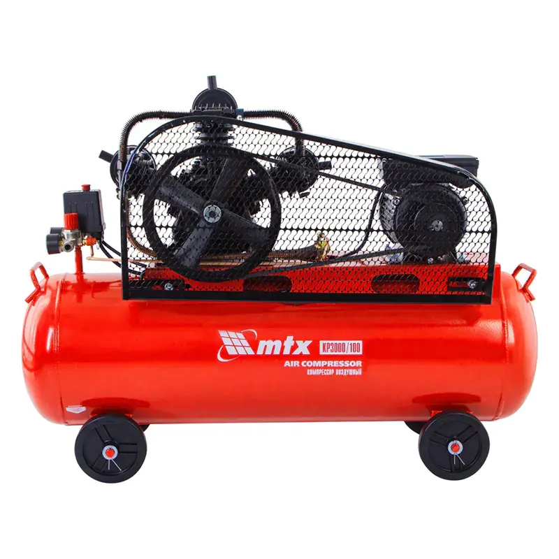 Компрессор MTX КР3000/100 с ременным приводом работает от поршневого двигателя мощностью 3,0 кВт. Корпус изготовлен из металла, окрашенного в красный цвет Инструмент оснащается воздушным баком объемом 100 л с производительностью 510 л/м.