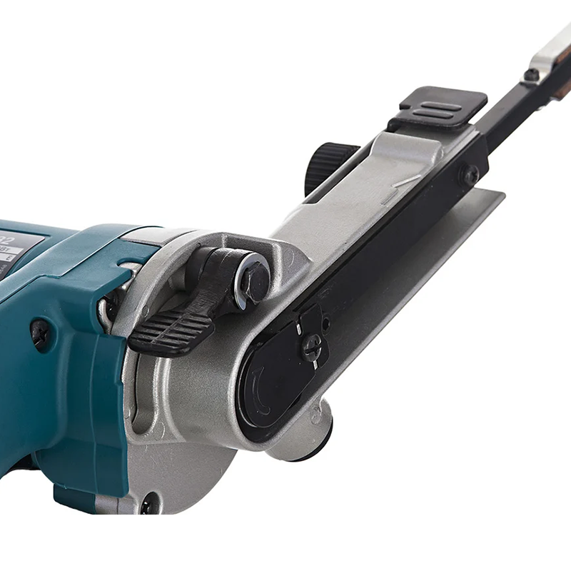Направляющую можно разворачивать на 100°. Есть отдельная рукоятка для юстировки шлифовальной ленты. Вы можете установить на инструмент ленту шириной 6, 9 или 13 мм. Рабочее полотно шлифовальной машины MAKITA 9032 меняется при помощи быстрозажимного крепления.