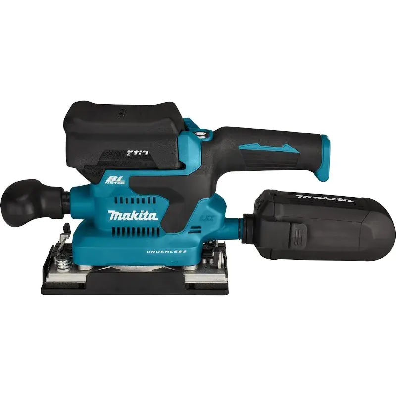Передняя рукоятка в шлифмашине Makita DBO381ZU позволяет эффективно обрабатывать большие открытые поверхности. При необходимости работы в труднодоступных местах её можно снять. Пылевыпускной патрубок в задней части позволяет закрепить на него пылесборный мешок с молнией или блок с фильтром. На него же можно надеть шланг пылесоса со стандартной посадкой. Модуль его беспроводной активации устанавливается в рукоятке под панелью управления.