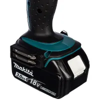Шуруповерт Makita DDF451RFE поставляется с двумя аккумуляторами. Запасная батарея позволяет подолгу работать, не прерываясь на подзарядку. Уровень оставшегося заряда можно проверить с помощью кнопки на аккумуляторном блоке. В случае перегрева или перегрузки срабатывает защита, отключающая двигатель.