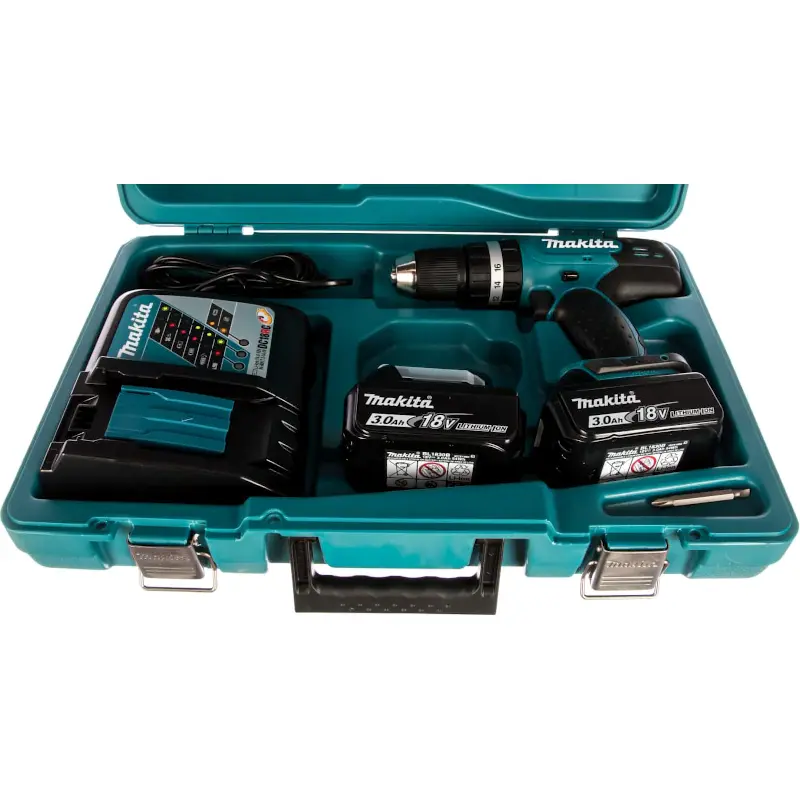 Шуруповерт поставляется в фирменном кейсе в комплекте с битой, зарядным устройством и двумя Li-Ion аккумуляторами напряжением 18 В емкостью 3 Ач, которые подходят к другим беспроводным инструментам Makita.