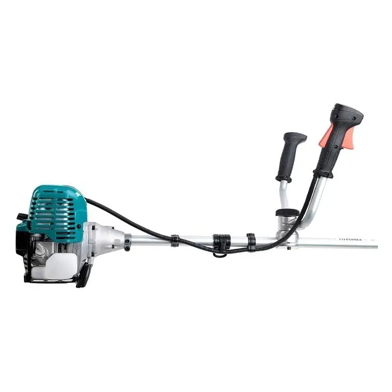 Все элементы управления бензинового триммера находятся под рукой оператора. Обороты двигателя можно регулировать путем переключения рычага дроссельной заслонки, расположенного на рукоятке управления. Катушка автоматически подает нейлоновый шнур диаметром 2,4 мм во время работы. Чтобы принудительно выдвинуть леску, достаточно слегка ударить триммерной головкой о поверхность земли. Помимо катушки в комплект поставки также входит трехлопастной нож, позволяющий срезать бурьян и мелкий кустарник.