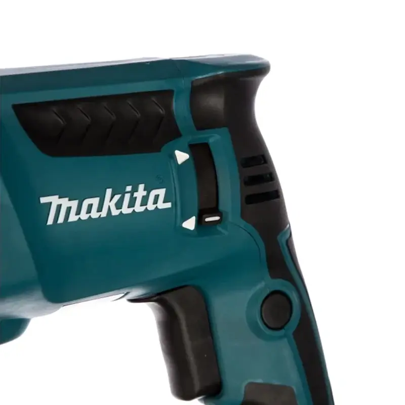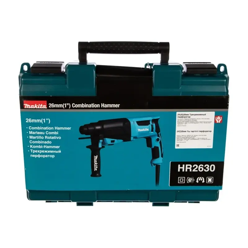 Сетевой перфоратор Makita HR2630 поставляется в прочном кейсе вместе с набором из пяти буров для ударного сверления и долбления кирпичной кладки, бетона, камня, других прочных строительных материалов. В быстрозажимной патрон можно вставлять оснастку с хвостовиком системы SDS-plus. Электроинструмент мощностью 800 Вт работает от однофазной сети с напряжением 220 В. Максимальный диаметр сверления в кирпиче составляет 68 мм, металле — 13 мм, дереве — 68 мм.