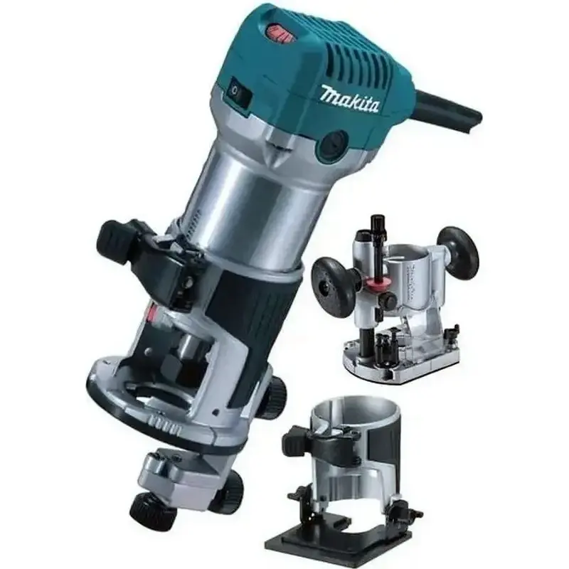 Кромочный фрезер Makita поставляется с тремя базами. Наклонное основание используется для обработки пазовыми фрезами под углом от -30 до 45_. Погружное основание применяется для врезки и создания фигурных отверстий в любом месте заготовки. Базовое основание позволяет обрабатывать кромки с глубиной погружении до 25 мм. Параллельная направляющая с упором обеспечивает удобство и точность реза на одинаковом расстоянии. Копировальные втулки 16 и 10 мм позволяют вырезать по заготовленному шаблону.