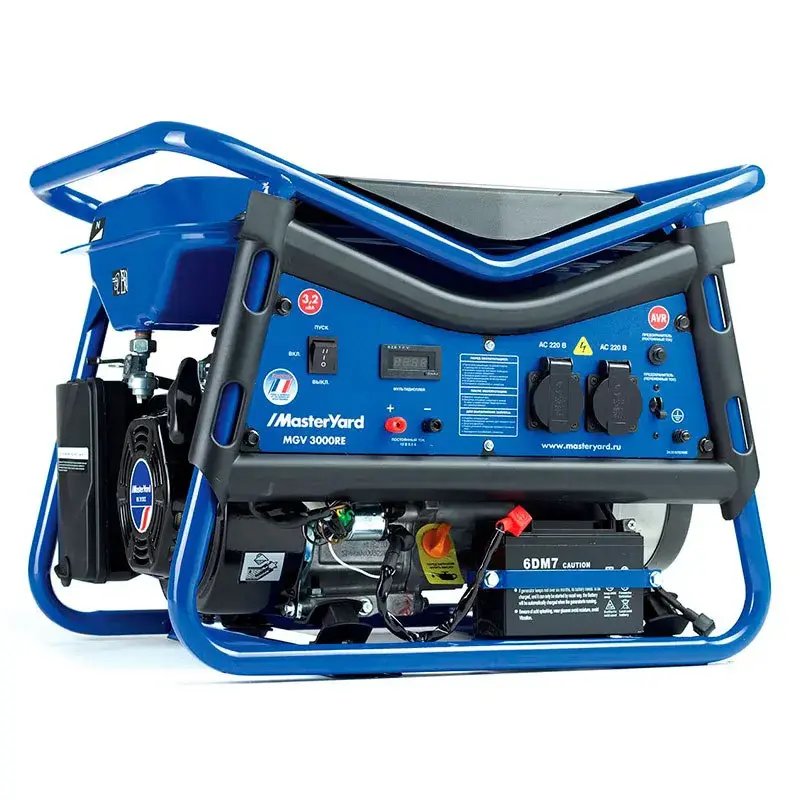 Генератор MasterYard MGV 3000RE используется в качестве резервного источника электроэнергии для бытовых приборов. Устройство способно проработать на полном баке бензина до 10 ч.