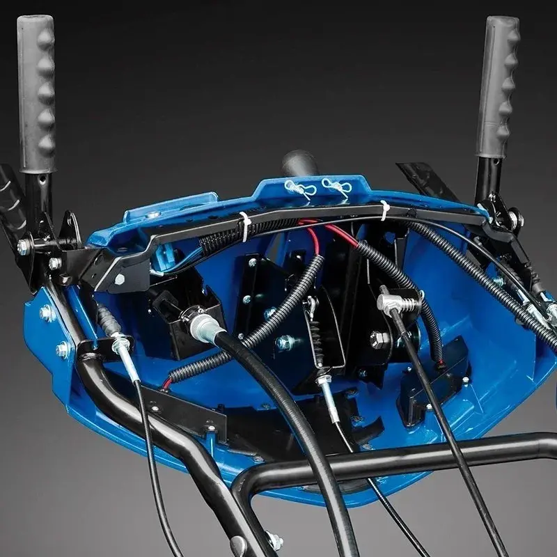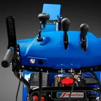 Максимальная дальность выброса снега составляет 15 м. Это позволяет не засорять расчищенную территорию. Значение регулируется с помощью наклона металлического козырька на патрубке.