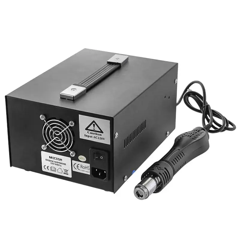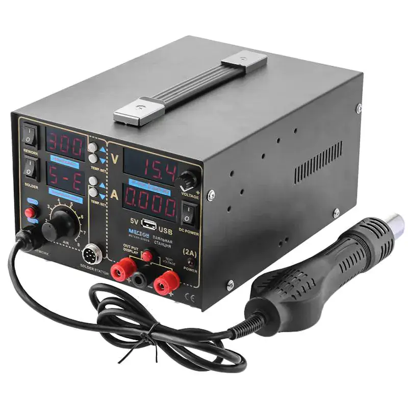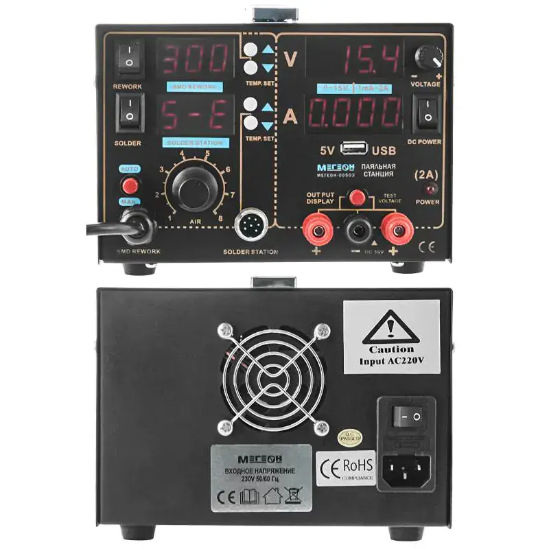 МЕГЕОН 00503 – это паяльная станция сочетающая в себе: термофен, паяльник и двухканальный источник питания, один из которых фиксированный (Канал1 - порт USB 5В), второй регулируемый (Канал2 - 0...15В, 2А). Совмещение двух настольных приборов в одном позволяет экономить место на рабочем столе. В ней реализовано: цифровые индикация, управление и стабилизация температуры, аналоговая настройка потока воздуха и напряжения. Благодаря распространённому типоразмеру - в продаже всегда большой ассортимент жал разной формы и размеров. Рукоятки имеют небольшой вес, мягкий провод и встроенные датчики положения. 3 сопла для термофена поставляются в комплекте. Яркие светодиодные дисплеи, удобные кнопки и ручки, защита от перегрузки. В качестве бонуса отключаемый режим сна. Она найдёт широкое применение при ремонте и обслуживании радиоэлектронных, мобильных и других устройств.