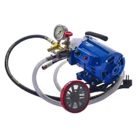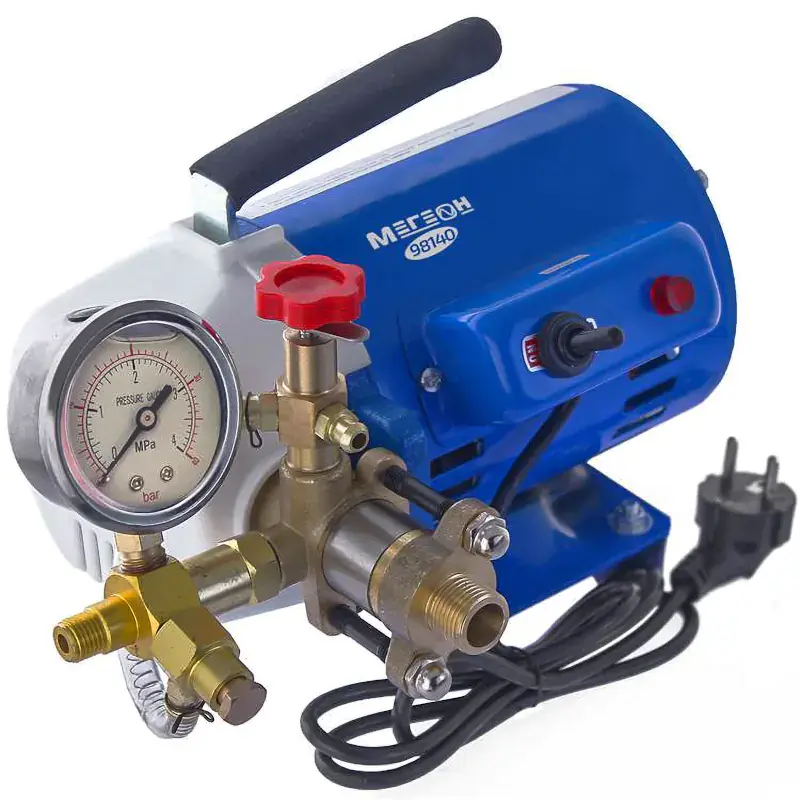 Электрический опрессовочный насос МЕГЕОН 98140 помогает проводить гидравлические испытания на герметичность систем водоснабжения, отопления, канализации и пожаротушения, паровых котлов, других трубопроводов и прочего технологического оборудования. Предельное нагнетаемое давление составляет 4 МПа. Состояние испытываемого контура удобно отслеживать по встроенному манометру с аналоговой шкалой. Пластиковый резервуар для жидкости не подвержен коррозии. В комплект поставки входят три шланга, переходник, уплотнения и фильтр грубой очистки. Устройство работает от бытовой сети с напряжением 220 В. Опрессовщик отличается низким уровнем шума во время работы.