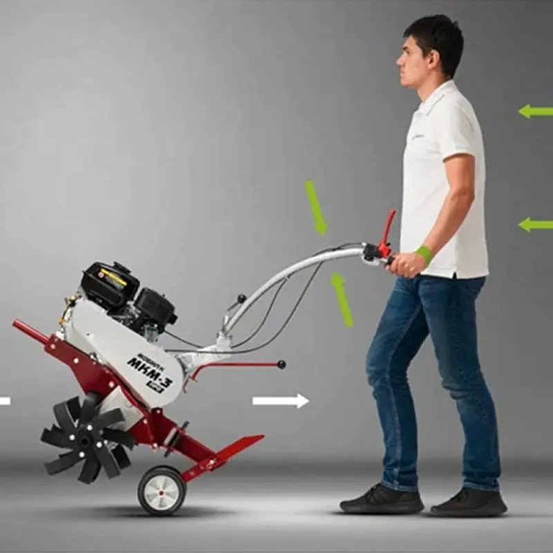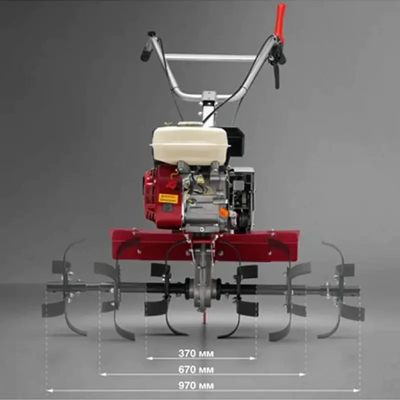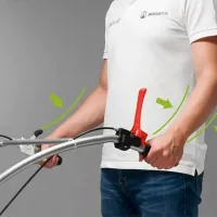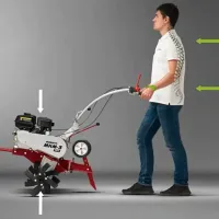 Ручка сцепления бензинового мотокультиватора не нагружает запястье. А технология Minimum Vibration Effect обеспечивает низкий уровень вибраций. Это возможно за счет руля, который крепится к редуктору, а не к раме. Роль также играют и антивибрационные вставки, которые снижают колебания до 50 %.