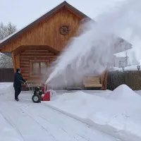 Модель справляется с сугробами высотой до 58 см. При этом прочные металлические шнеки перемалывают даже заледеневшие комки снега.