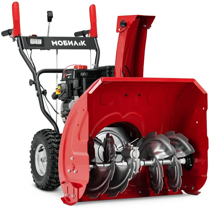 Бензиновый снегоуборщик Мобил Коснащен двухконтурной системой переработки снежной массы. Первый контур состоит из пары цельнолитых шнеков, закрепленных на прочном валу с подшипниками. Второй контур включает турбину-крыльчатку, которая работает на высоких оборотах, увеличивая дальность выброса.
