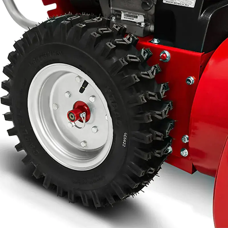 На снегоуборщик установлены зимние колеса X-TRAC размером 42 х 12 см. Каждое выдерживает вес в 200 кг. Они обеспечивают хорошее сцепление как с рыхлым снегом, так и с обледеневшими дорожками. Для повышенной прочности колеса обладают стальными цельноштамповынными дисками.
