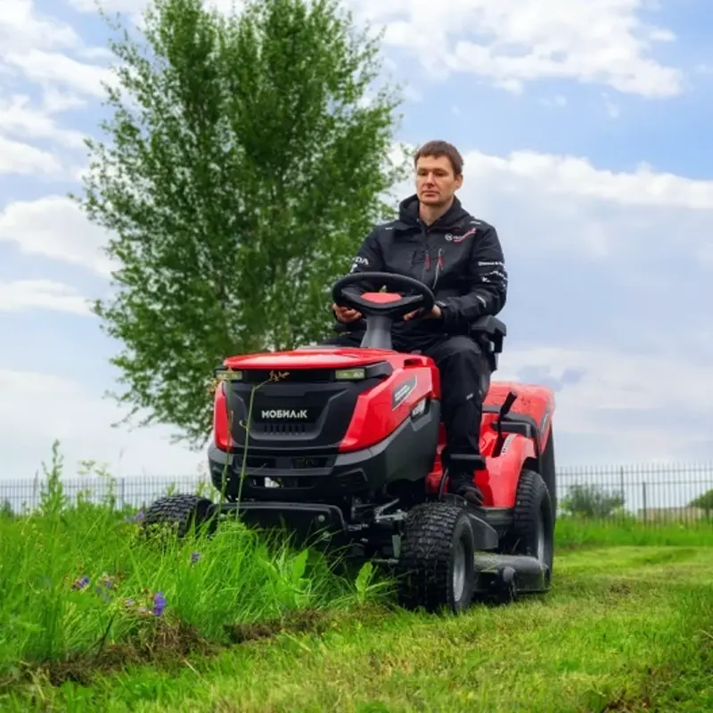 Садовый трактор МОБИЛ К XP114 ПРЕМИУМ — это современная самоходная машина, объединяющая функции трактора и газонокосилки. Стрижка травы выполняется с помощью высокопроизводительной декой увеличенного размера шириной 114 см, что делает эту модель идеальной для участков площадью от 0,5 до 1 гектара. В комплект входит задняя сцепка, которая позволяет использовать различное прицепное оборудование — прицепы, газонные катки, разбрасыватели семян, аэраторы и другое, расширяя возможности трактора. Машина оснащена мощным бензиновым двухцилиндровым двигателем Briggs&Stratton 2000 EXi с чугунной гильзой и системой смазки под давлением, что увеличивает срок службы мотора и позволяет работать без перерыва в течение целой смены. В тракторе применена бесступенчатая автоматическая гидротрансмиссия, исключающая необходимость переключения передач. Максимальная скорость движения вперёд достигает 8,8 км/ч, назад — до 4,5 км/ч.
