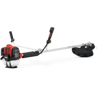 Положение рукоятки велосипедного типа на штанге можно отрегулировать. Управление бензиновым триммером осуществляется через кнопки и рычаги, которые для удобства вынесены на одну ручку. С полуавтоматической катушкой для удлинения лески не надо прекращать работу, достаточно слегка стукнуть триммерной головкой о землю. Кожух, совместимый с любой режущей насадкой, защищает оператора от попадания скошенной травы и мелкого мусора.
