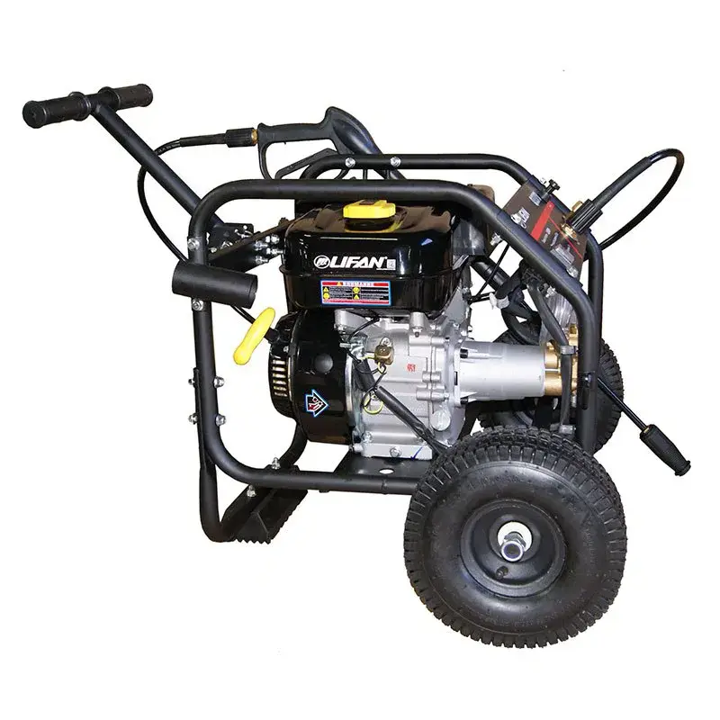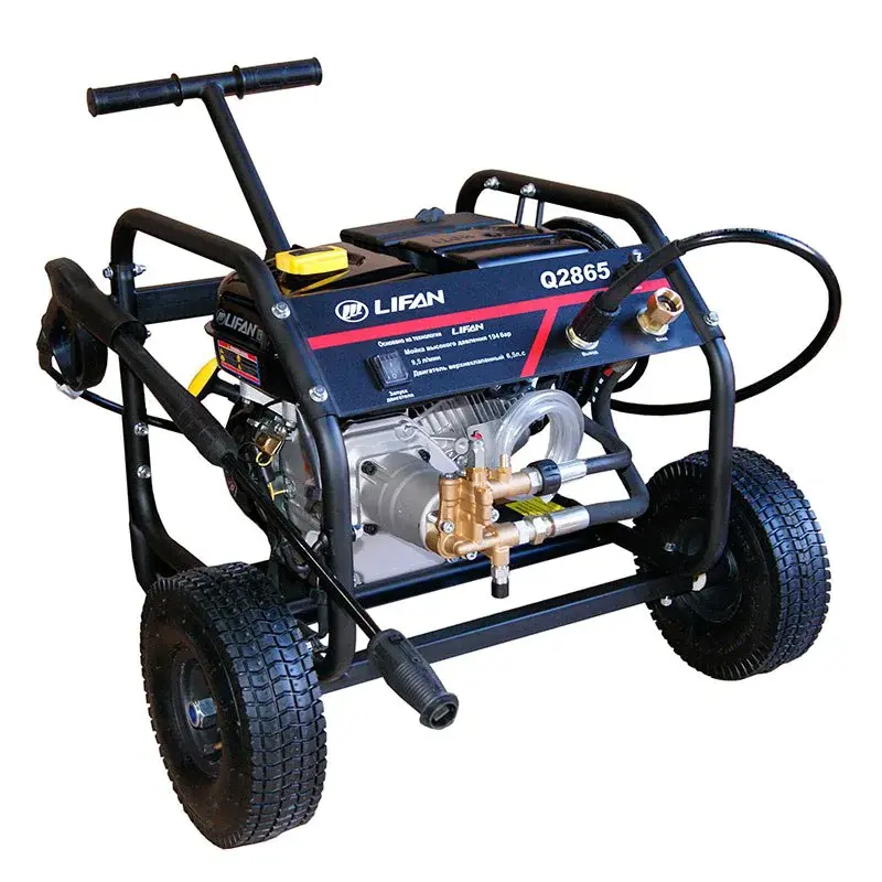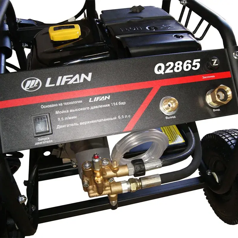Мойка высокого давления Lifan Q2865 – бытовая модель с двигателем мощностью в 4,8 кВт. Аппарат подходит для удаления загрязнений с автомобилей, садового инвентаря, придомовых дорожек и т.д. Мойку легко перемещать по участку т.к. для этого предусмотрены большие колеса с рельефной поверхностью и рукоятка.