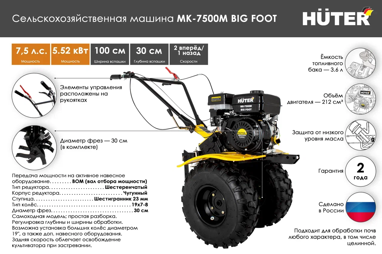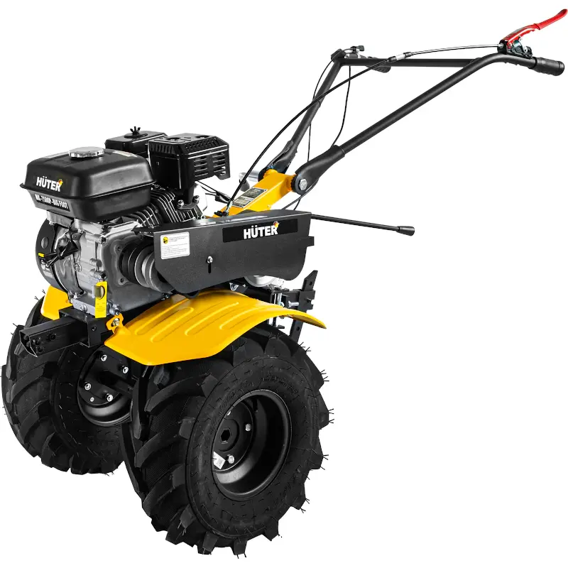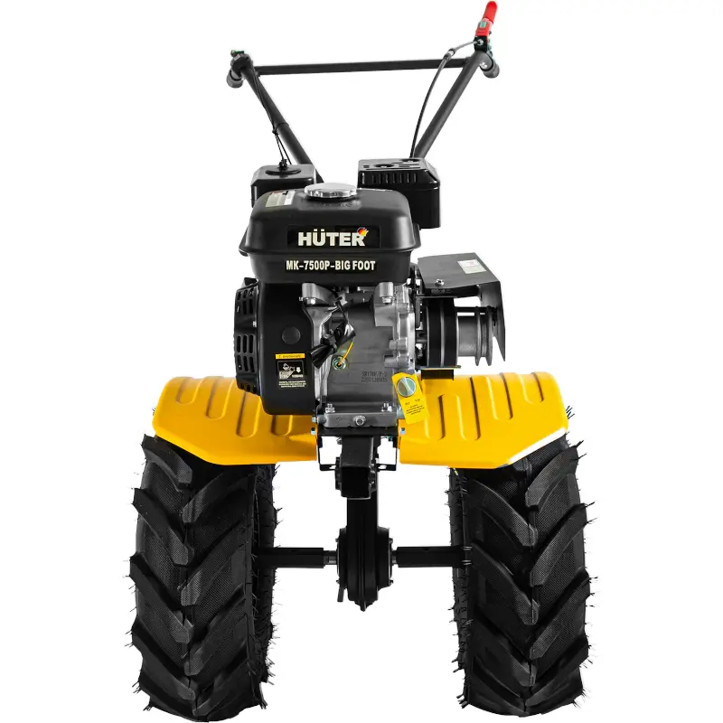 Сельскохозяйственная машина Huter МК-7500Р BIG FOOT оснащена большими колесами с глубоким протектором шин, которые помогают культиватору пройти по мокрой вязкой земле, не увязая в ней. Благодаря чему, при установке прицепа, вы можете применять мотоблок для перевозки грузов по бездорожью и распутице.