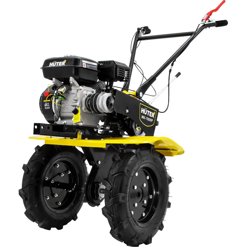 Сельскохозяйственная машина Huter МК-7800P оборудована чугунным корпусом редуктора, который защищает ее от механических повреждений. Ступица выполнена в виде шестигранника диаметром 23 мм, она позволяет устанавливать на мотоблок большие пневматические колеса. Ременной привод обеспечивает плавный ход агрегата без перегрузки механизма, при этом он работает практически бесшумно.