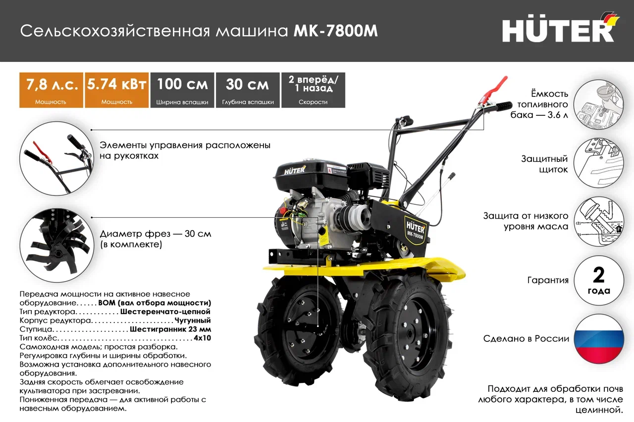 Мотоблок Huter МК-7800P – это самая производительная модель серии с шириной обработки 100 см. Для удобного использование аппарата предусмотрено две передние передачи и одна задняя. При установке навесного оборудования вы можете расширить область применения мотоблока и использовать его, например, как газонокосилку или окучник.