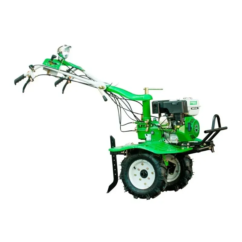 Вы можете отрегулировать положение рукояток управления как по горизонтали вращением на 360 градусов, так и по высоте. На левой рукоятке расположены рычаг сцепления и механизм экстренной остановки, на правой – рычаги газа и управления задним ходом. При транспортировке и хранении мотоплуга руль можно снять. Большие пневматические колеса обеспечивают высокую проходимость мотоплуга. Боковые диски защищают растения вдоль пашни от контакта с фрезами.