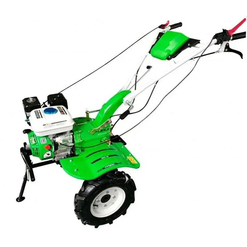 Бензиновый мотоблок оснащен одноцилиндровым четырехтактным двигателем объемом 207 см3 с верхним расположением клапанов и воздушным охлаждением. Ручной стартер позволяет быстро завести мотор. Прочный чугунный корпус защищает редуктор от повреждений при работе со сложным грунтом. Бензобак вмещает 3,6 л топлива, позволяет долгое время работать без дозаправки.