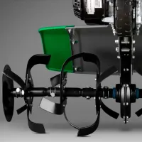 В бензоплуге есть привод переднего навесного оборудования. Это позволяет устанавливать на агрегат роторную газонокосилку, подметальную щетку, снегоуборщик и т.д. Навесное оборудование докупается отдельно с учетом типа работы и времени года.