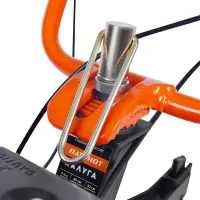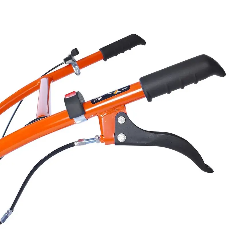 Для удобного использования предусмотрена складная рукоятка с функцией вертикальной регулировки. Резиновые накладки на ручках обеспечивают комфорт при продолжительных работах.