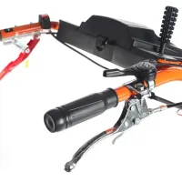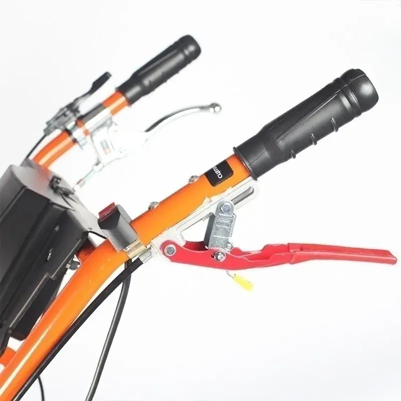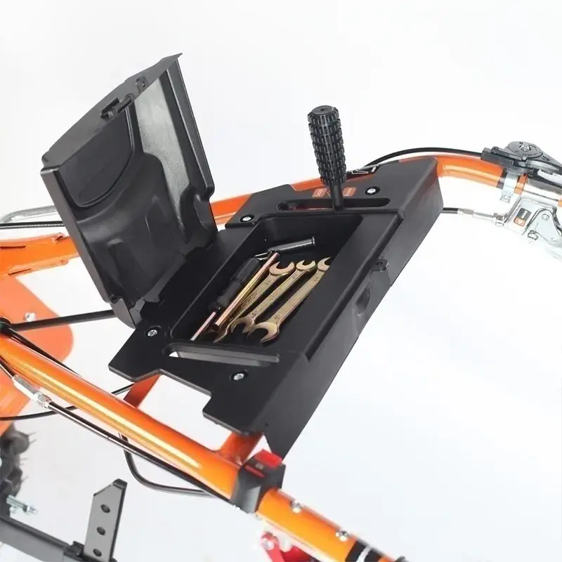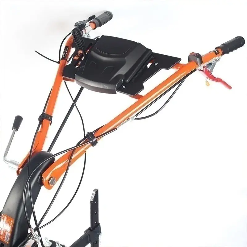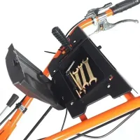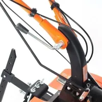 Наклон руля регулируется вручную. Рукоятку можно сложить в направлении двигателя. В таком виде агрегат займет минимум места во время хранения.