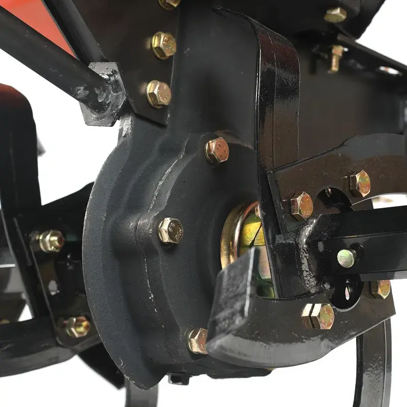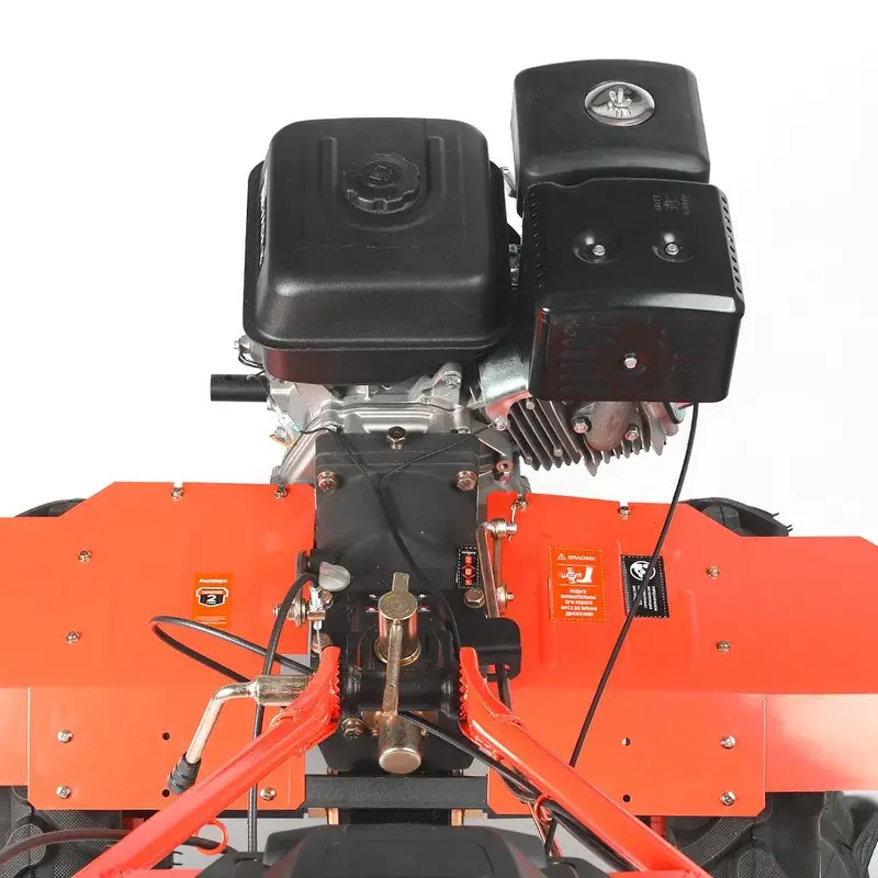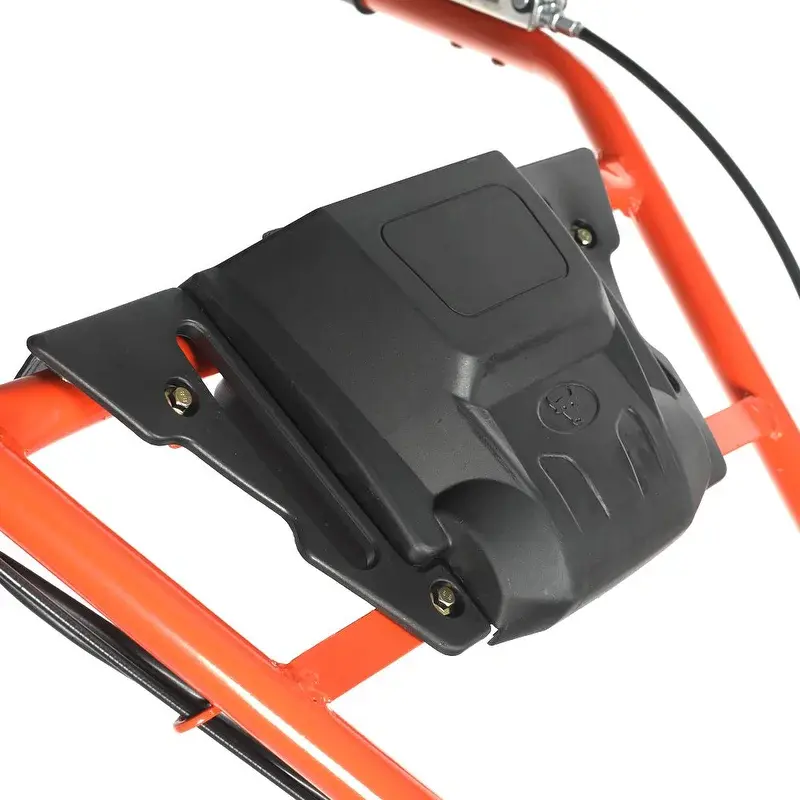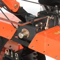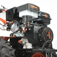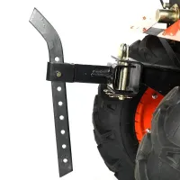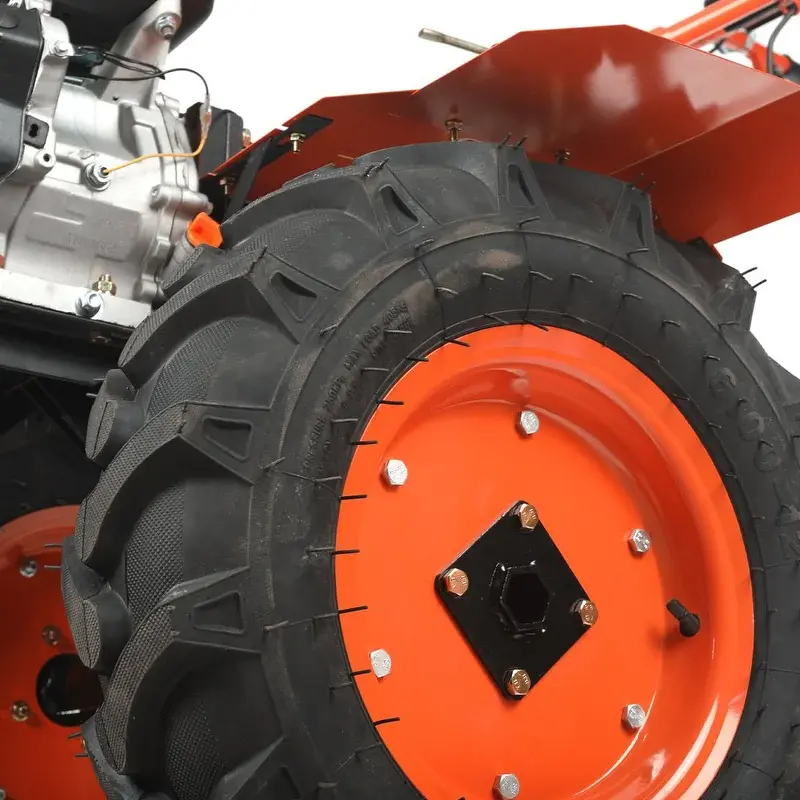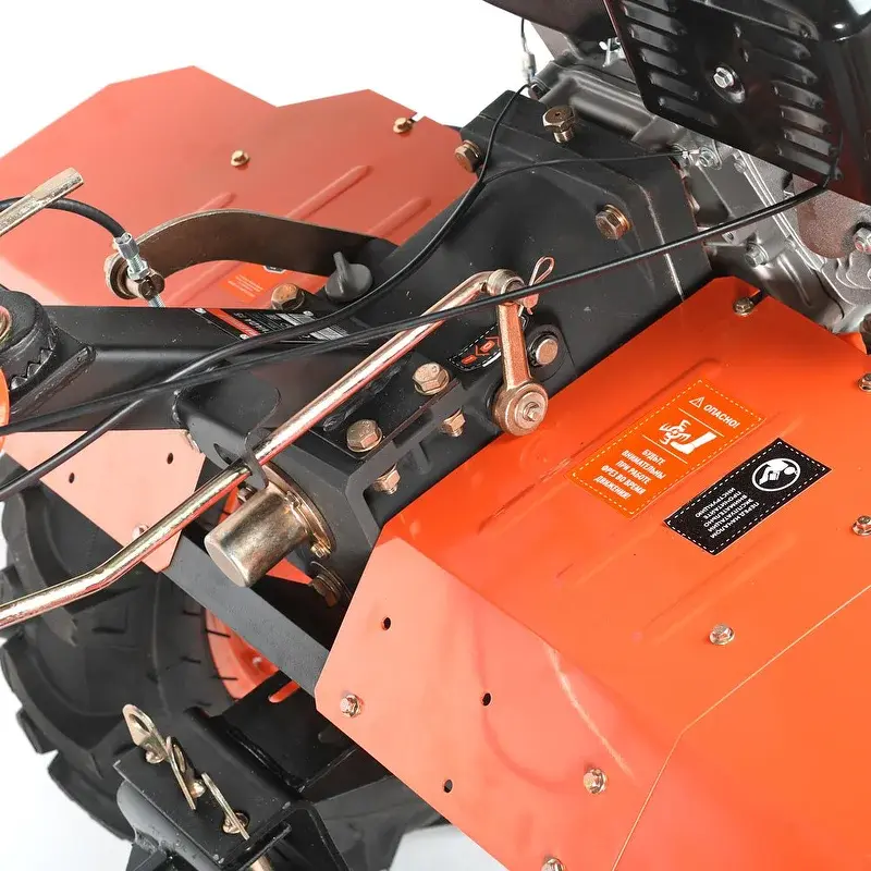 Два больших пневматических колеса тракторного типа делают модель вездеходной. Мотоблок легко проходит по кочкам, рыхлой земле и склонам. Над каждым колесом расположено защитное крыло. Ограждение не позволит грязи, пыли и мелким камням попасть вам в лицо во время работы.