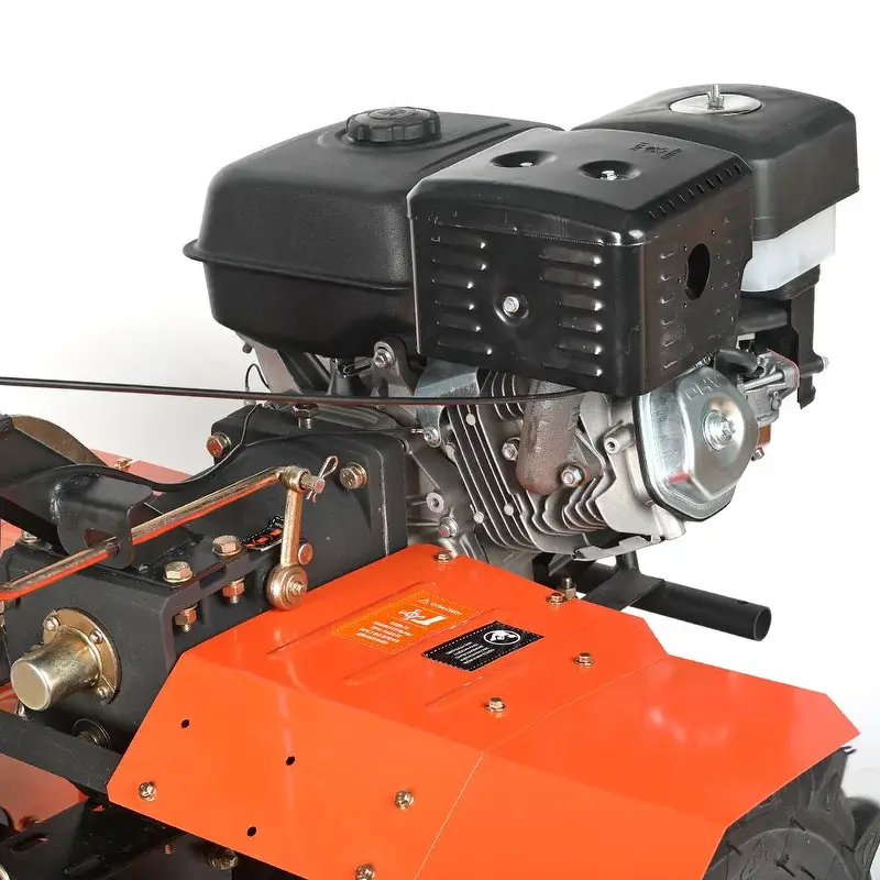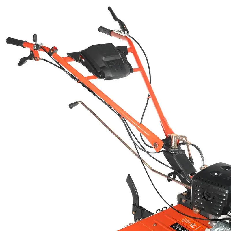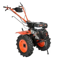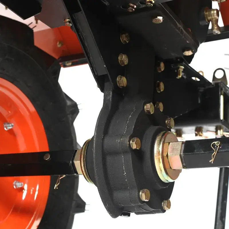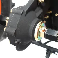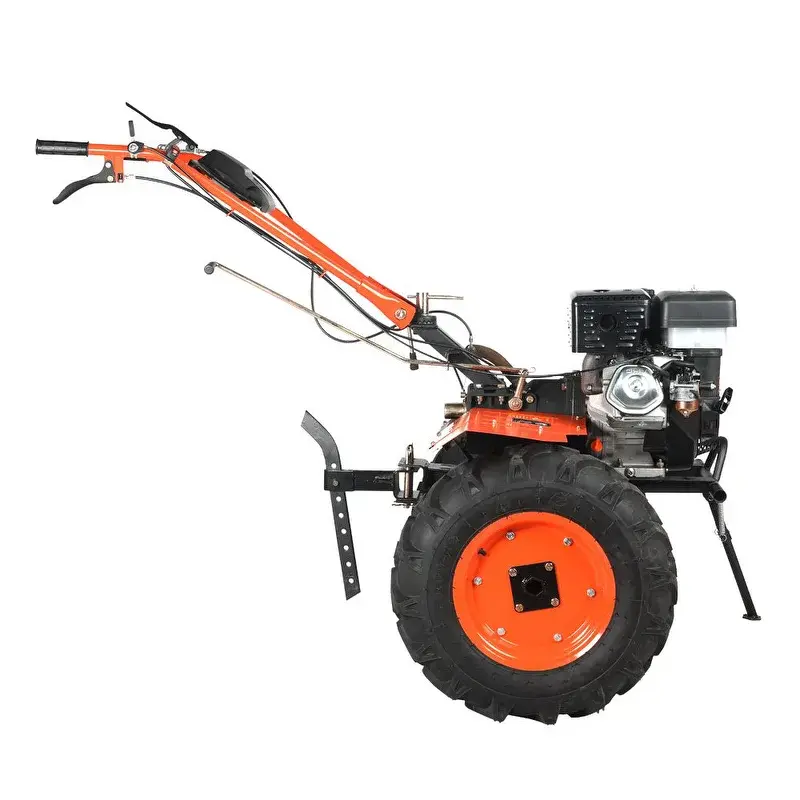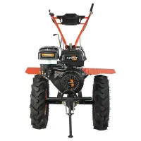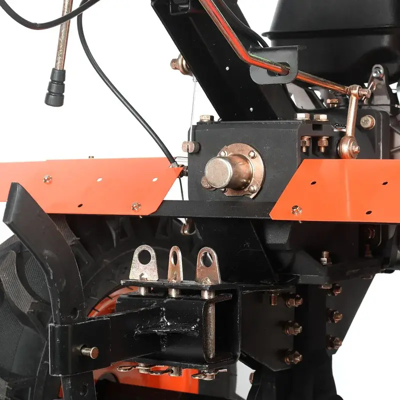 Два больших пневматических колеса тракторного типа делают модель вездеходной. Мотоблок легко проходит по кочкам, рыхлой земле и склонам. Над каждым колесом расположено защитное крыло. Ограждение не позволит грязи, пыли и мелким камням попасть вам в лицо во время работы.
