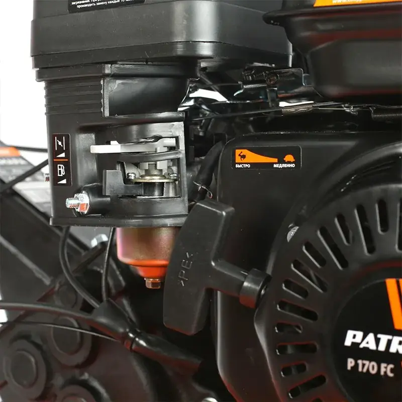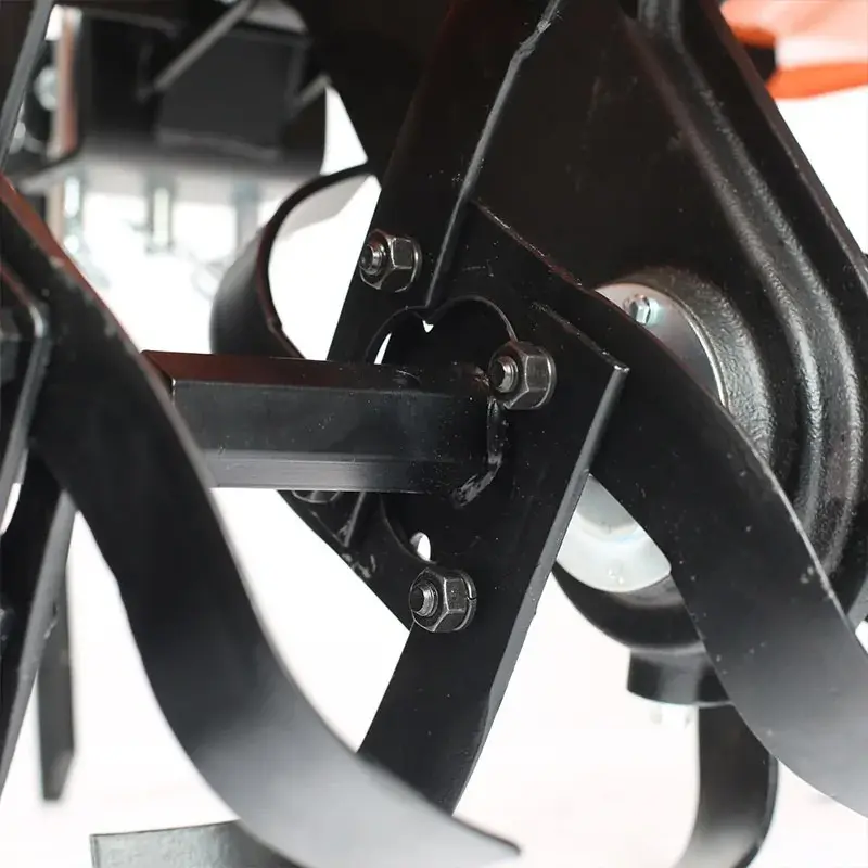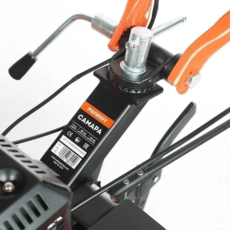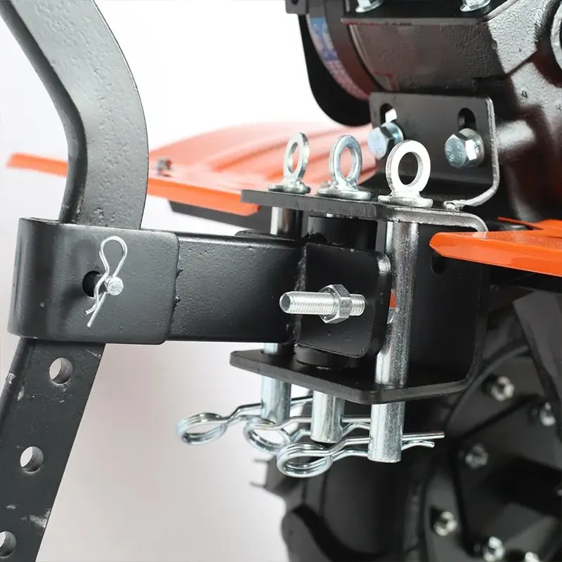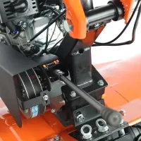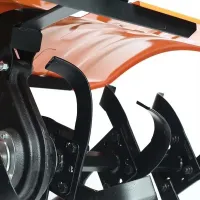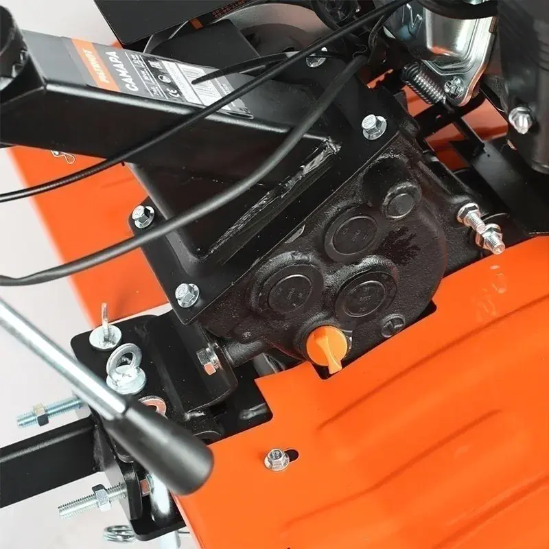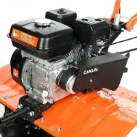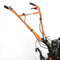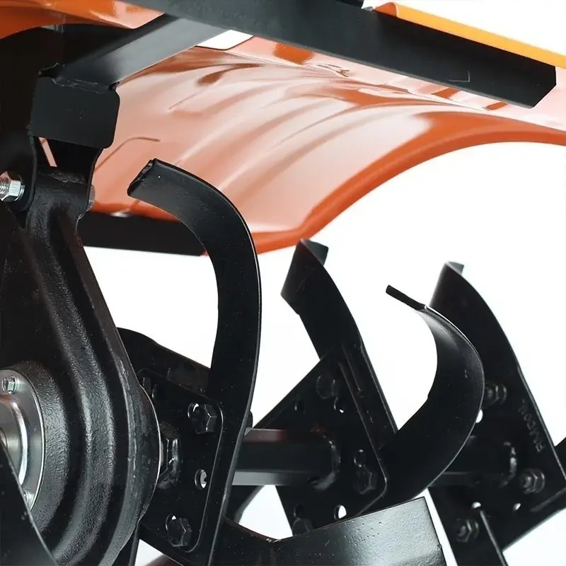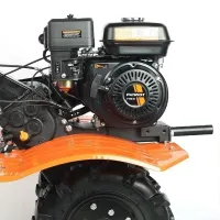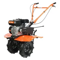 Мощный мотоблок с большой шириной захвата и чугунным редуктором, укомплектован закаленными фрезами, что позволяет применять его на тяжелых грунтах и для обработки целины. Наличие в комплекте пневматических колес позволяет использовать совместно с тележкой. Есть возможность установки косилки.