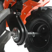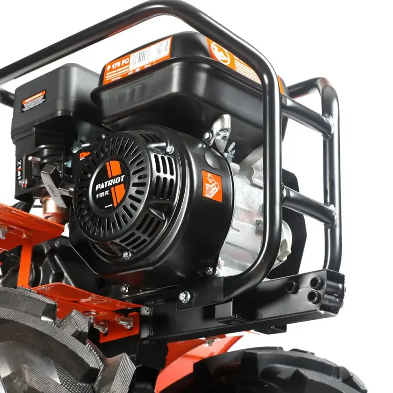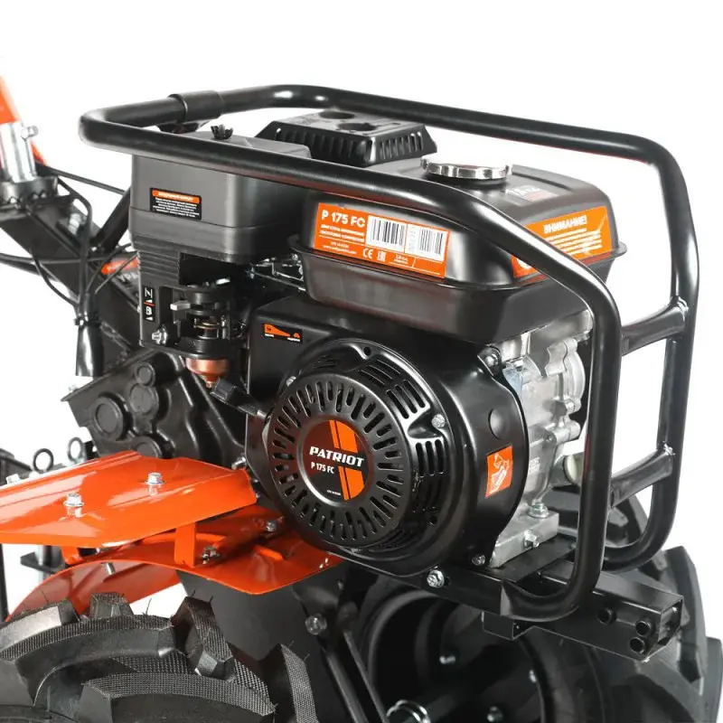 Бензиновый мотоблок оборудован 4-тактным двигателем Patriot Р175FC мощностью 7,8 л.с., который раскручивает режущие элементы до максимальной скорости 107 об/мин. Модель оснащена фрезами диаметром 32 см, которые позволяют обрабатывать тяжелый грунт. В комплект поставки включен сошник, при помощи которого можно регулировать глубину вспашки.