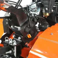 Коробка передач позволяет настраивать оптимальные параметры работы в зависимости от выполняемой задачи. Для движения вперед предусмотрены 4 скорости, для перемещения назад - 2. Переключение на повышенную и пониженную передачи осуществляется перекидыванием ремня с одной проточки шкива на другую.