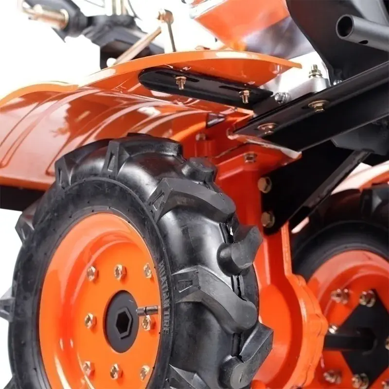 Вне зависимости от того, установлены на мотоблоке фрезы или колеса, есть большая вероятность вылета камней и грязи при работе. Металлические щитки над рабочей частью аппарата защитят вас от этой проблемы. Наличие брызговиков будет особенно актуально в мокрую и дождливую погоду.