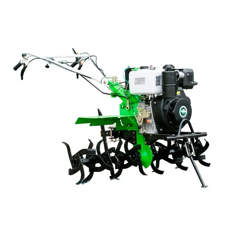 Aurora SPACE-YARD 1350D - дизельный мотоблок предназначенный для профессионального использования, то есть, для обработки больших участков. Это самая мощная машина в линейке садовой техники AURORA. Основные достоинства аппарата: Электростартер с аккумулятором 36 Ah, в отличие от конкурирующих моделей, которые, как правило, имеют аккумуляторы 18 Ah, + облегчённая система ручного пуска двигателя, надёжная зубчатая передача с длительным сроком службы, прочный чугунный корпус редуктора предохраняет узел от камней, возможность подключения дополнительного оборудования через вал отбора мощности (роторная сенокосилка, помпа, снегоуборщик и пр.), усиленная сцепка позволяет оснастить аппарат плугом, телегой, сошником и пр. шестигранные оси надёжно фиксируют колёса, фрезы или грунтозацепы надёжный и экономичный, дизельный двигатель мощностью 9 л.с. обладает большим запасом моторесурса по сравнению с бензиновыми одноклассниками. Коробка передач- 3х скоростная: 2 скорости движения вперёд и 1 назад. Скромный расход топлива и большой бензобак позволяют долгое время работать без дозаправки. Ширина обработки почвы от 800 до 1350мм. Глубина культивации – 300 мм. Кроме того, аппарат массой 117 кг - способен работать с плугом без дополнительного утяжеления. Регулировка рукояток управления возможна, как по горизонтали на 360 градусов, так и по вертикали.