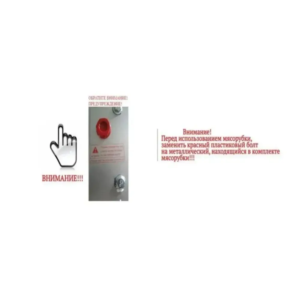 Перед использованием мясорубки необходимо заменить красный пластиковый болт на металлический, он идет в комплекте.