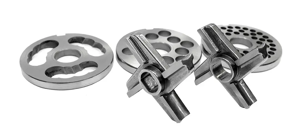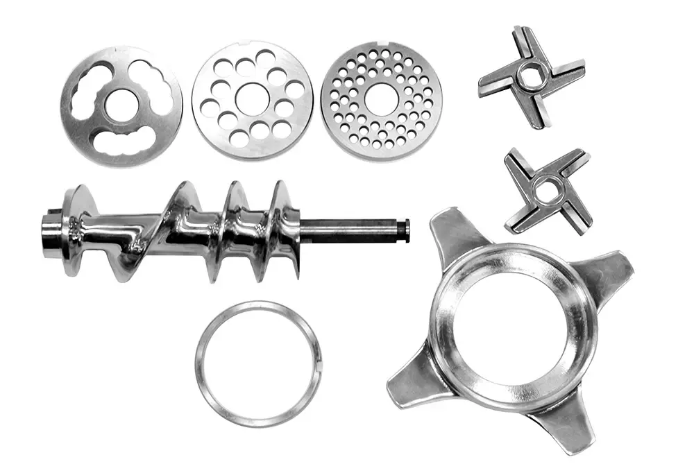 Корпус настольной мясорубки из нержавеющей стали Aisi201, шнек и хобот из нержавеющей стали Aisi 202.