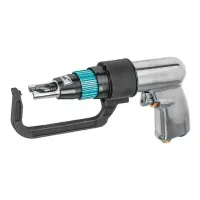 Пневматическая скоростная дрель пистолетного типа применяется для удаления сварочной точки в листовых металлах, соединенных методом точечной сварки. Съемная опорная скоба облегчает обработку закраин и отбортовок при позиционировании инструмента. При работе обязательно использовать средства защиты органов зрения и слуха.