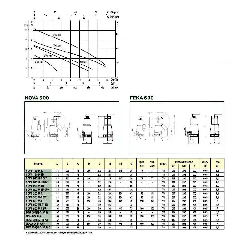 Погружной насос FEKA 600 T-NA – SV от компании DAB является отличным помощником в системах дренажа, как индивидуальных, так и коллективных, а также хороший помощник в отводах бытовых, хозяйственных или фекальных вод. Выполнен такой насос из качественных материалов, обладают высокими характеристиками и долгим сроком годности. Большая часть насоса сделана из чугуна и нержавеющей стали. Корпус насоса, рабочее колесо, верхняя крышка и решетка выполнены из технополимера. Нержавеющая сталь учувствовала в изготовлении двигателя, вал и крепежные винты. Насос FEKA 600 T-NA – SV обладает асинхронным двигателем с продолжительной работой. Ротор вращается в высококачественных шарикоподшипниках, которые не нуждаются в смазке, из-за чего увеличивается продолжительность работы. Оптимальное погружение для работы доходит до 7 метров. Максимальный напор данного устройства достигает 7.45 метров, а максимальный расход доходит до 15.9 кубических метров в час. FEKA 600 T-NA – SV обладает двойным сальникововым уплотнением на валу двигателя вместе с масляной предкамерой.