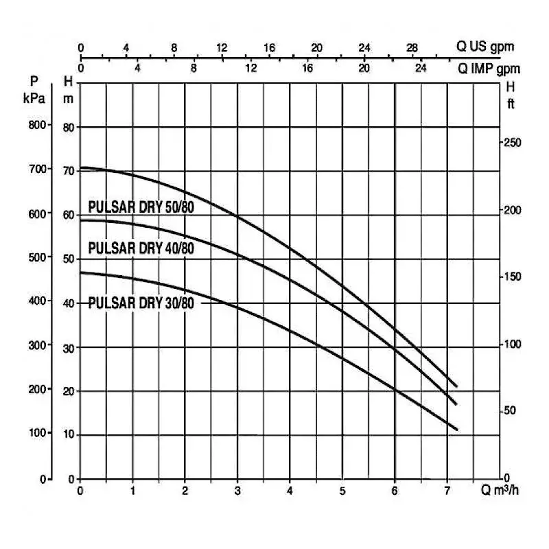 Насос PULSAR DRY 30/80 T-NA разработано специально для индивидуальных и коллективных систем водоснабжения. Рабочий диапазон: производительность – от 0,9 до 7,2 куб.м/ч, напор – до 82 м. водяного столба. Максимальное рабочее давление: максимальная глубина погружения – 20 м. Перекачиваемая жидкость. Состав: чистая, без твердых включений и минеральных масел, не вязкая, химически нейтральная, по характеристикам аналогичная воде. Максимальное содержание песка в воде – 50 г/куб.м. Температура – от 0°С до +40°С. Основные материалы. Рабочие колеса и диффузоры – из технополимера; внешний кожух, кожух двигателя, основание насоса со всасывающим патрубком, вал и крепежные элементы – из нержавеющей стали. Торцевые уплотнения масляной камеры: со стороны гидравлической части – карбид кремния/карбид кремния, со стороны двигателя – графит/керамика. Особенности: Многоступенчатый колодезный насос. Уплотнение вала – масляная камера с двумя торцевыми уплотнениями. Однофазные модели укомплектованы встроенным конденсатором и тепловым выключателем с автоматическим перезапуском. Для трехфазных моделей требуется внешняя защита от перегрузки. Все модели оборудованы всасывающим патрубком. Монтаж. Вал двигателя – в вертикальном положении. Возможен вариант "сухой" установки. При продолжительной работе насос может находиться в не полностью погруженном положении. Комплект поставки: насос в сборе с кабелем 20 м. Стандартное электропитание: 1x230 В, 3x400 В. Степень защиты: IP 68. Класс изоляции: F.