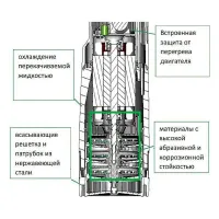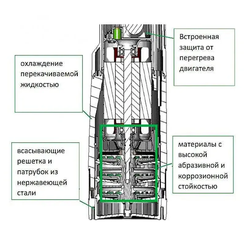 Мотор охлаждается за счет перекачивания жидкости. Это позволяет насосу стабильно работать даже при частичном погружении в воду.