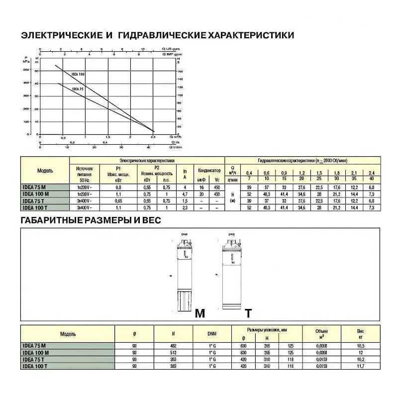 Насос IDEA 75 T разработан специально для индивидуальных и коллективных систем водоснабжения. Для скважин диаметром 4" и более. Рабочий диапазон: производительность – от 0,4 до 2,4 куб.м/ч, напор – до 52 м. водяного столба. Максимальное рабочее давление: максимальная глубина погружения – 20 м. Перекачиваемая жидкость. Состав: чистая, без твердых включений и минеральных масел, не вязкая, химически нейтральная, по характеристикам аналогичная воде. Температура: от 0°С до +35°С. Основные материалы. Гидравлический корпус и основание двигателя – из чугуна; рабочее колесо – из бронзы; кожух двигателя, вал и крепежные элементы – из нержавеющей стали. Особенности. Гидравлическая часть содержит одно рабочее колесо "вихревого" типа. Двигатели однофазных моделей оборудованы встроенным конденсатором. Для трехфазных двигателей требуется внешняя защита от перегрузки. Монтаж. Вал двигателя – в вертикальном положении. Комплект поставки: насос в сборе с кабелем длиной 15 м и нейлоновым тросом длиной 15 м. Стандартное электропитание: 1x230 В, 3x400 В. Степень защиты: IP 68. Класс изоляции: F.