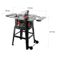 По бокам от пильного диска расположены гнезда для установки лобзика и фрезера. Дополнительные отверстия расширяют функционал устройства, делая его универсальным и подходящим для разных задач.