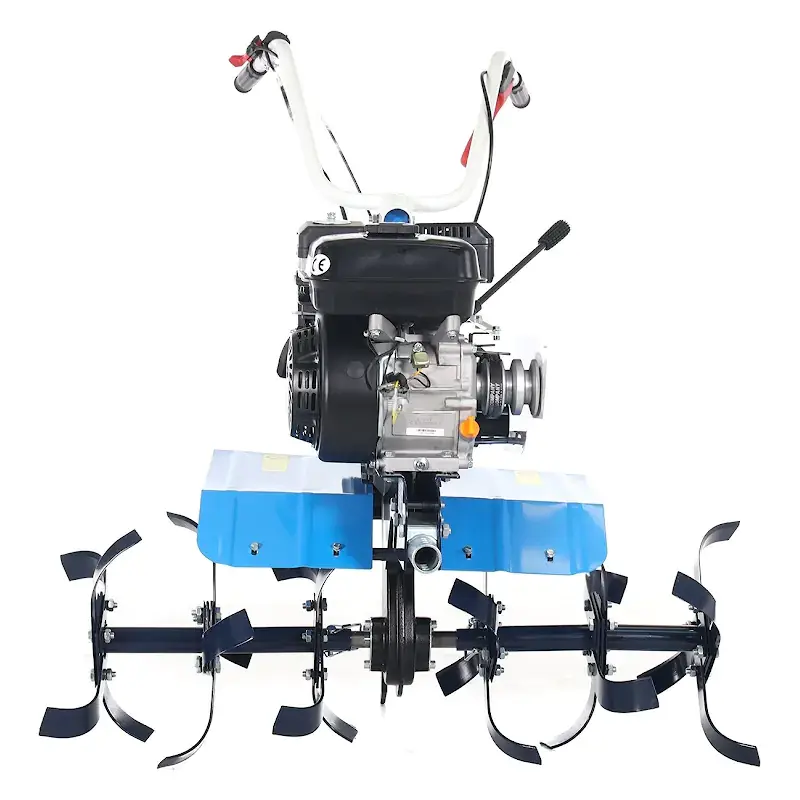 Ширина культивации почвы зависит от установленного навесного оборудования и может составлять от 600 до 975 мм. В комплекте с мотоблоком поставляется шесть фрез, которые позволяют рыхлить землю, окучивать грядки и нарезать борозды. За счет большого тягового усилия техника будет эффективна с различным навесным оборудованием: окучником, плугом, снегоочистителем и т.д.