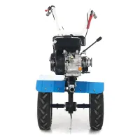 Большие колеса тракторного типа обеспечивают отличное сцепление с поверхностью и позволяют проезжать по неровностям на участке. Благодаря этому бензиновый мотоблок едет и по пашне, и по песку. Над колесами располагается защитное крыло.