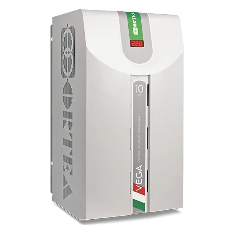 Стабилизатор напряжения ORTEA Vega 10 имеет 2 варианта подключения: до 9 кВа и до 12 кВа с высокой точностью выравнивания 0,5 %. Модель обладает молниезащитой, способна работать на морозе и рассчитана на многократные перегрузки.