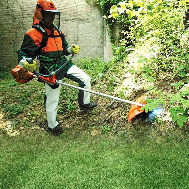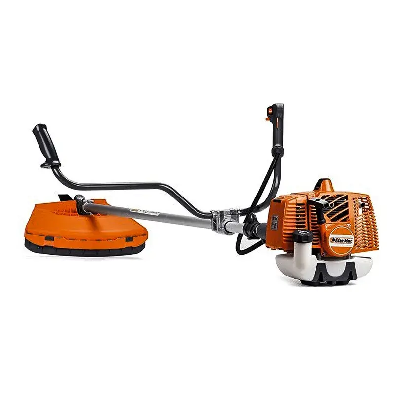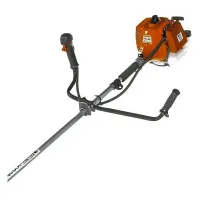 Бензиновый триммер оснащен рукояткой велосипедного типа, которая позволяет совершать размашистые дугообразные движения, обеспечивающие высокую производительность кошения. Длину лески можно увеличить прямо во время работы — для этого достаточно слегка ударить триммерной головкой по земле. Помимо катушки в комплект поставки входит металлический трехлопастной нож для срезания высоких сорняков и поросли кустарников. Система облегченного запуска позволяет оператору прилагать меньше усилий для вытягивания шнура стартера двигателя. Ранцевый ремень с двумя широкими мягкими лямками эффективно снижает нагрузку на оператора.
