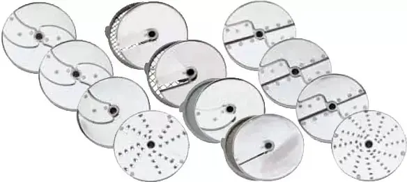 Полная гамма из 50 дисков (опционально), позволяющая производить все формы нарезки: прямые и фигурные ломтики, соломка и полоски, натирать на терке, нарезать кубиками и брусочками для картофеля фри